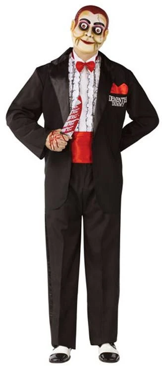Adult size mens creepy Halloween ventriloquist Demented Dummy fancy dress costume includes a black suit style jacket matching black trousers red bow tie red cumberband and a mask.