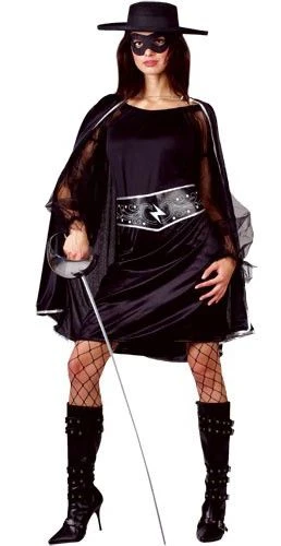 Zorro the black clad masked swordsman who defends the people of the land often uses his sword to leave a distinctive mark a Z made with three quick cuts. You decide who makes the cut in this sexy Bandit Beauty costume that leaves much to the imagination but also highlights your signature style. Complete Costume Includes; Dress Cape Belt Hat & Mask