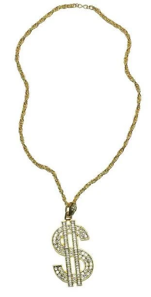 Dollar Sign Necklace Amazing quality The Necklace pictured here is gold plated metal and it is encrusted with glass rhinestones for plenty of bling.