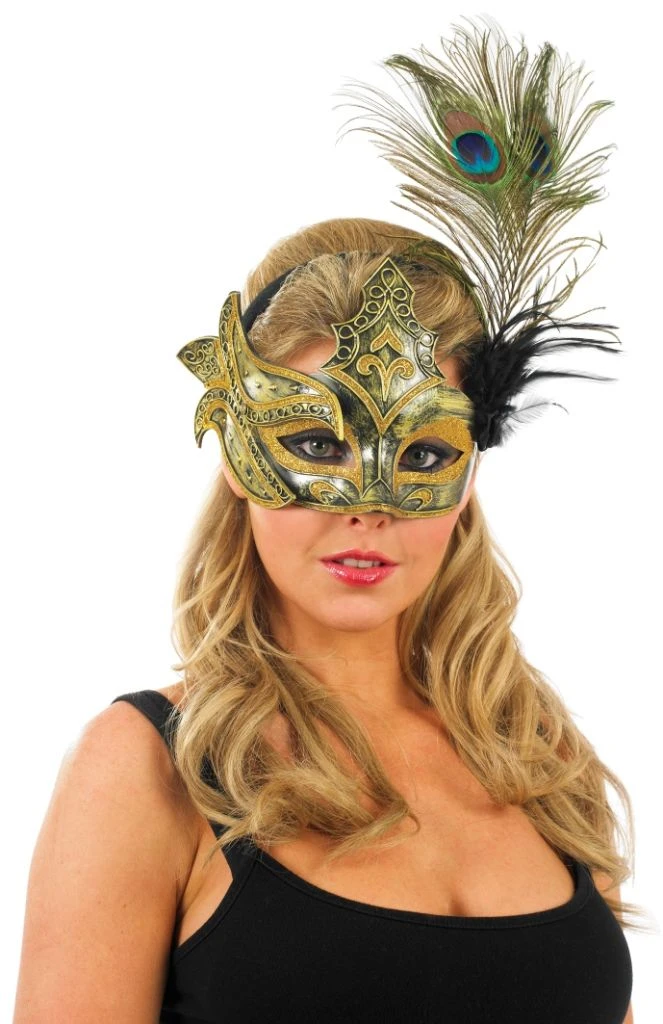 This exquisiteGold Detail and Peacock Feather Mask will give you a stunning masquerade party look at a price that can’t be beat. The quality mask which frames the top half of your face with authentic look complimented by gold details and topped off by a stunning feather bouquet. This mask hold on a hadband. This is a great look for a women looking to impress at a fancy dress party in an iconic Venetian carnival accessory.