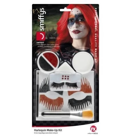Harlequin Make-up KitThis Harlequin Make-Up Kit is perfect for adding the finishing touches to your Harlequin Costume . This kit includes face stickers eye lashes gem stickers face paints and an applicator. Wear this with your harlequin costume and wig for Halloween and fancy dress parties.