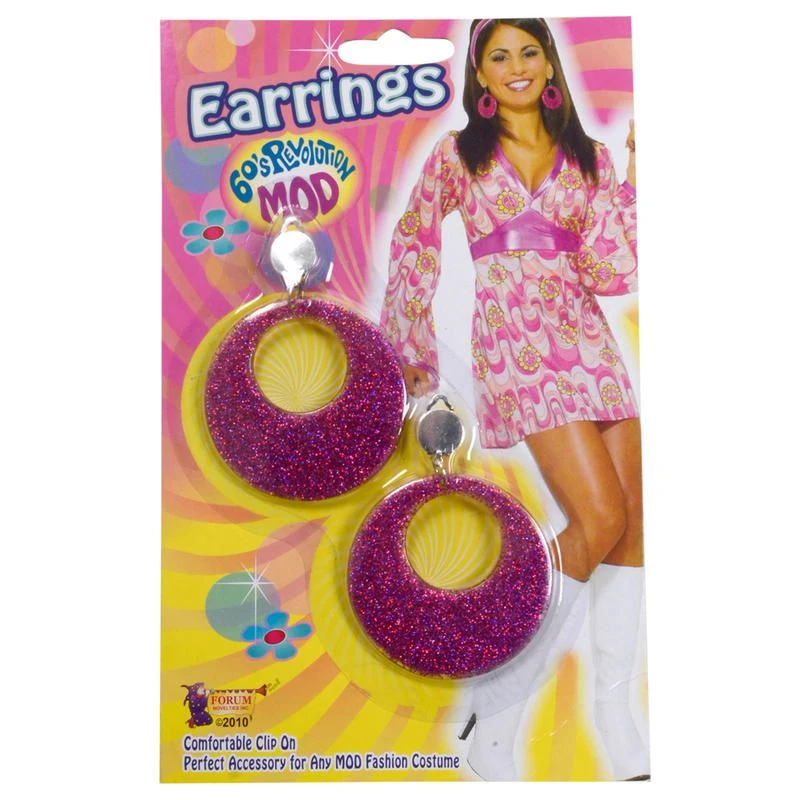 Customise your costume with these cool pink mod 60s revolution glitter earings. Features a pair of comfortable clip on pink glitter retro style earrings.