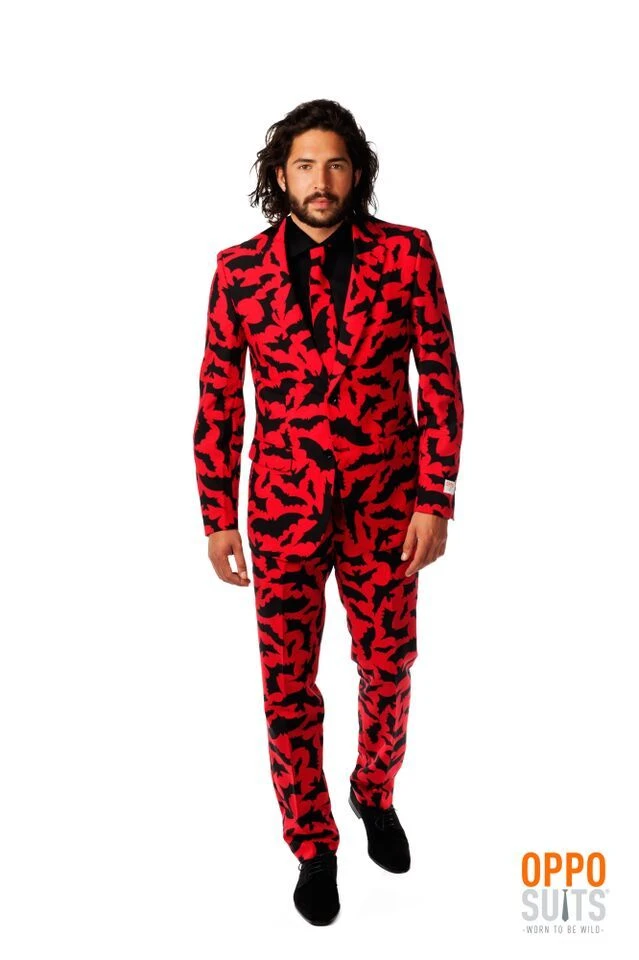Opposuits Bat Guy Fancy Dress Suit | Here at Any Costume we don’t just offer a all sorts of Fancy Dress. We also offer full range of opposuits.This outfit comes with the Bat Guy print jacket trousers and dress tie. Size small fits mens jacket size UK38 medium fits mens jacket size UK 40 and size large fits mens jacket size UK 42. Exclusive to Anycostume.