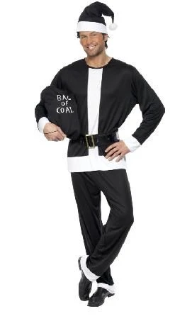 Santa for the Naughy ListAmazing qualitySanta For The Naughty List consists of a black trousers with white trim at the bottom of the legs a matching long sleeved top buckled belt hat and to finish off the look a bag with Bag of coal printed on it.