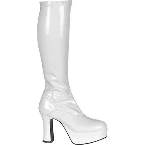 You’ll be an Earth angel in these sweet and sexy white boots! Ideal for womens fantasy costumes: a sexy nurse costume a go-go costume an angel costume or whatever else you can dream up! White knee-high patent leather look boots with 5-inch heel.